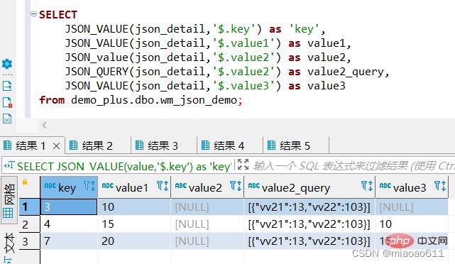 SELECT JSON_VALUE(json_detail,'$.key') as 'key', JSON_VALUE(json_detail,'$.value1') as value1, JSON_value(json_detail,'$.value2') as value2, JSON_QUERY(json_detail,'$.value2') as value2_query, JSON_VALUE(json_detail,'$.value3') as value3 from demo_plus.dbo.wm_json_demo;