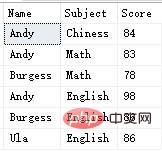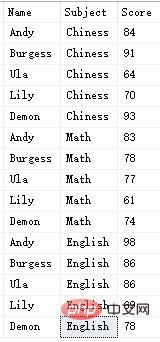 有一张学生表,分别name,学科,分数 这三个字段,如下: