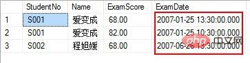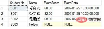 SELECT T1.StudentNo, T1.Name, T2.ExamScore, T2.ExamDate FROM Student AS T1