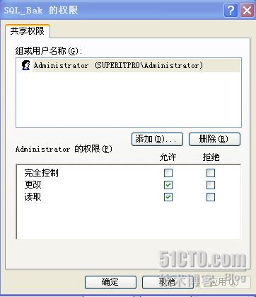 2:在文件备份服务器中建立一个共享文件夹,共享权限中删除everyone用户,加入administrator用户,权限设置如下图。