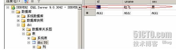 我们在SERVER1的DB1数据库中的YG表中插入一条记录,杜飞 男 29