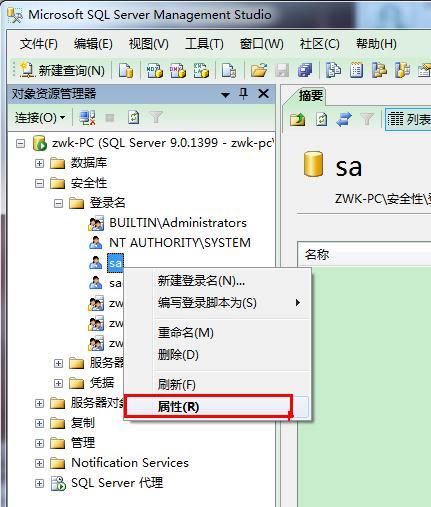 接下来在安全性下的登录名下“sa”上右击属性,进行密码设置