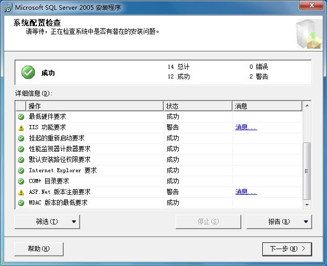 4、之后,郑重其事的系统配置检查完全说明了一切,与其最适系统Win2003全部通过,没有警告是一样的。