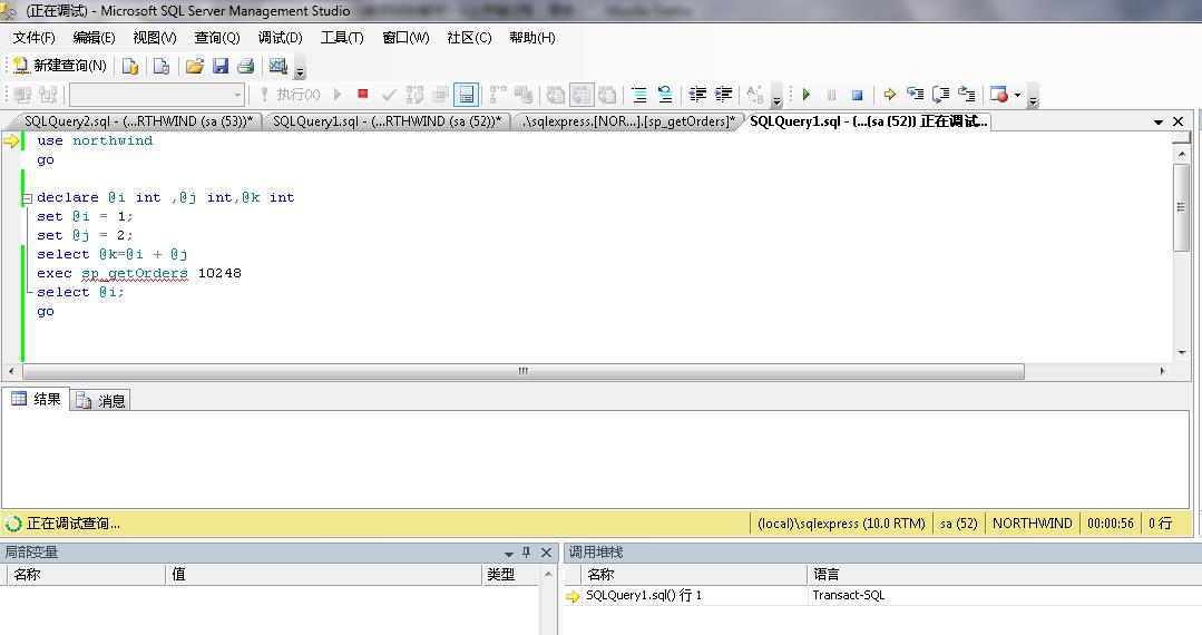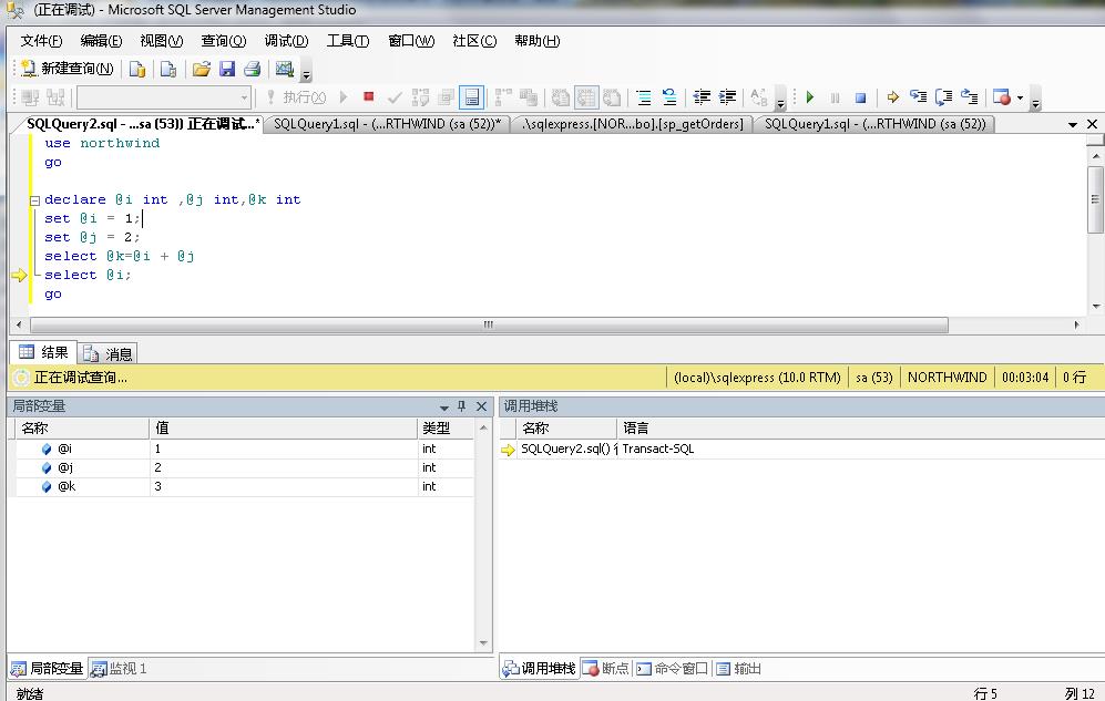 非常简单的定义了 三个int 型变量:i、j、k并且对这些变量进行简单的逻辑运算,在Management Studio 中只要轻松的按F11键,即可调试以上代码块。