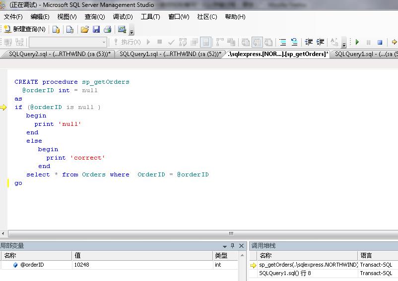 当断点经过exec sp_getOrders 10248 这段代码时,点击F11进入sp_getOrders存储过程进行逐语句debug。
