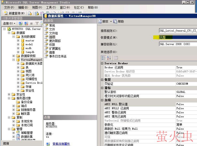 5.1、确认数据库使用了完整恢复模式:打开SQL Server Management,在VirtualManagerDB数据库(将要镜像的数据库)上点击右键选择属性,定位到选项页,将恢复模式改为“完整”