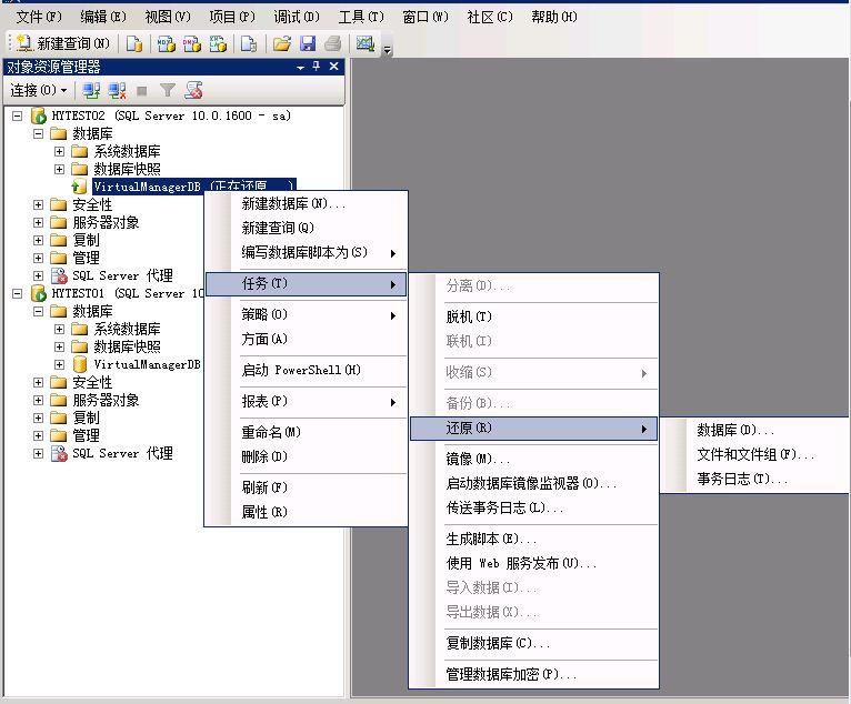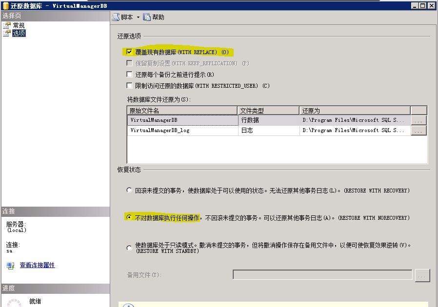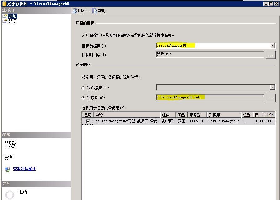 选定备份文件,写入还原数据库名称,注意此数据库名称必须与主体服务器数据库名称一致。即VirtualManagerDB。