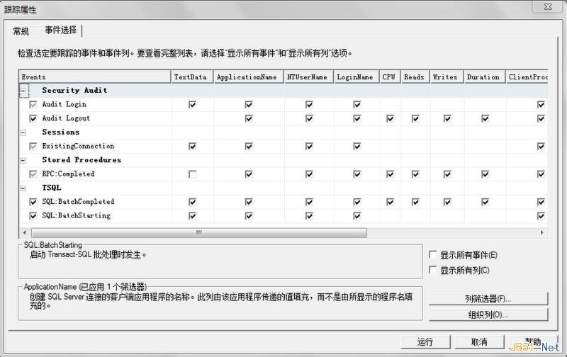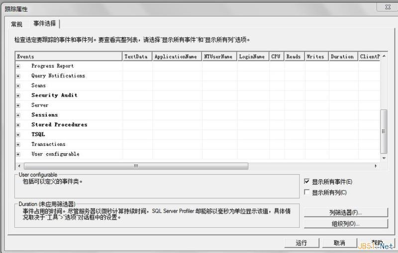 现在回到那个事件选择面板,只有已经被选择的事件才会被显示。如果想显示所有可供选择的事件,则只需选中“显示所有事件”单选框,要添加一个跟踪事件,在Event列中查找一个事件类下的事件,并单击其左边的检查框;要删除不需要的事件,取消选中的事件选择框。