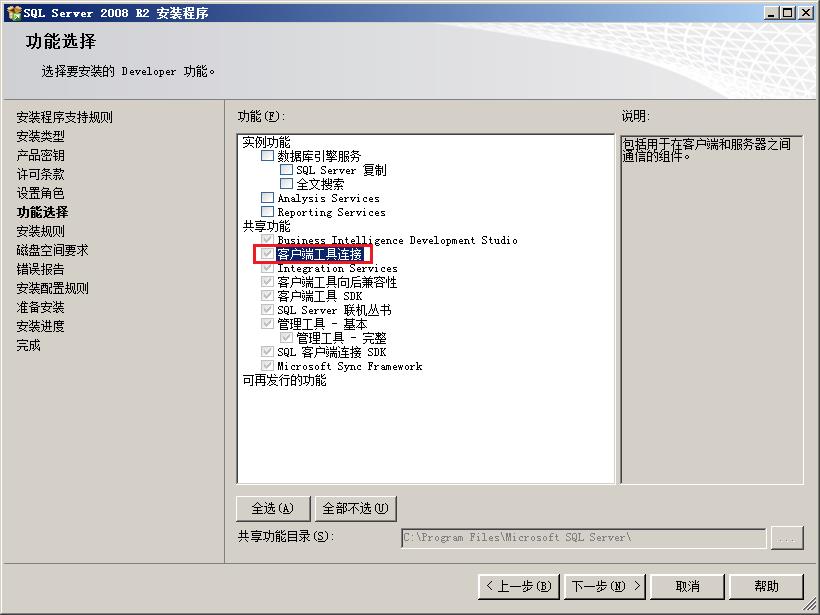 注:如果只需要安装SQLServer客户端(SQLServerNativeClient),只需要选择“客户端工具连接(ClientToolsConnectivity)”。