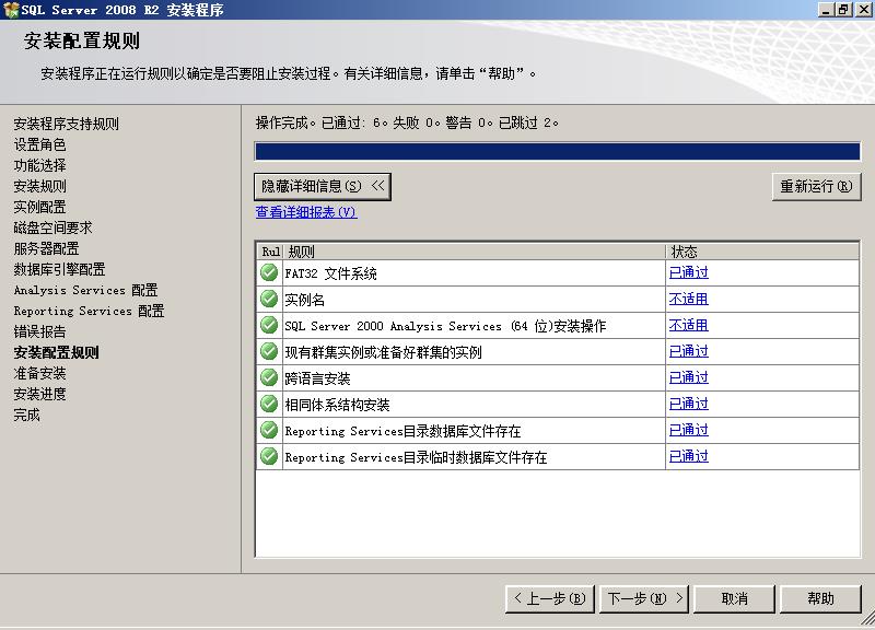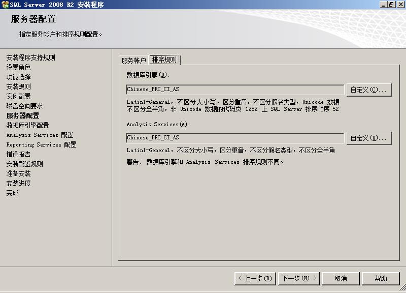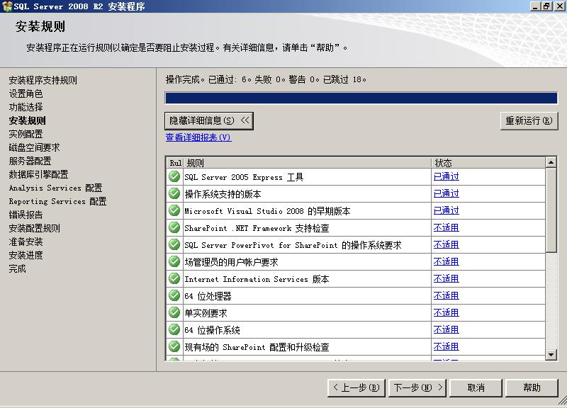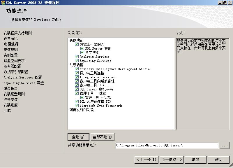 在这里,我们点一下“全选”按钮,会发现左边的目录树多了几个项目:在“安装规则”后面多了一个“实例配置”,在“磁盘空间要求”后面多了“服务器配置”、“数据库引擎配置”、“AnalysisServices配置”和“ReportingServices配置”。