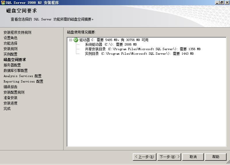 从这里可以看到,安装SQLServer的全部功能需要5485MB的磁盘空间。