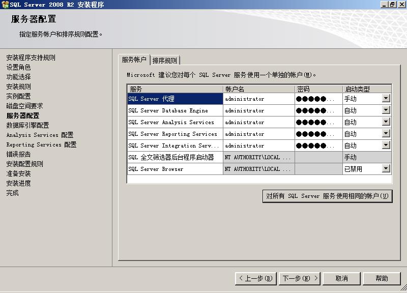 在这里,首先要配置服务器的服务帐户,也就是让操作系统用哪个帐户启动相应的服务。为了省事,我们选择“对所有SQLServer服务使用相同的帐户”。