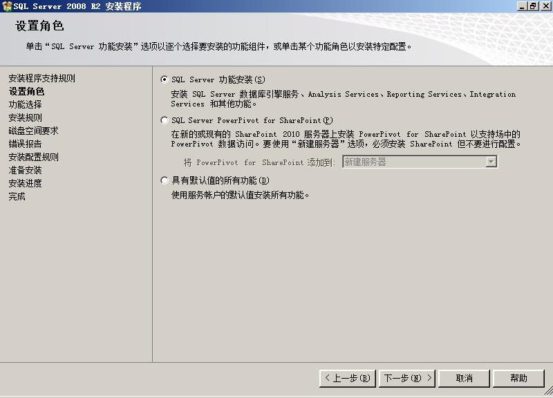 这里有3个选项可供选择。我们选择“SQLServer功能安装”。