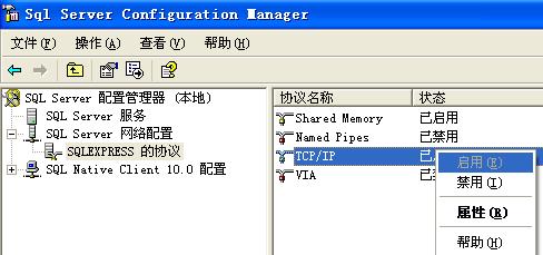 2. 选择SQL网络配置->SQLEXPRESS的协议,选择右边的TCP/IP, 此协议默认为禁用状态,点右键选择启用,将其设置为启用状态,