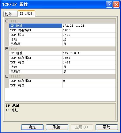 3.在TCP/IP上点右键,选择"属性",打开TCP/IP的属性页。将协议选项卡中的全部侦听从原来的"是"设置为"否",然后选择IP地址选项卡,其中会列出本机的所有IP地址,将要设置可以远程访问的IP地址的"已启用"和"活动"都设置为"是",将TCP端口号设置为1433,将TCP/IP动态端口设置为0,如图所示