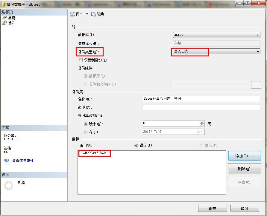 首先新建一个数据库dbtest,注意创建数据库时恢复模式一项选择'完整',在数据库中新建一个Table_1,并插入一些数据,然后对该数据库做一个完整备份。