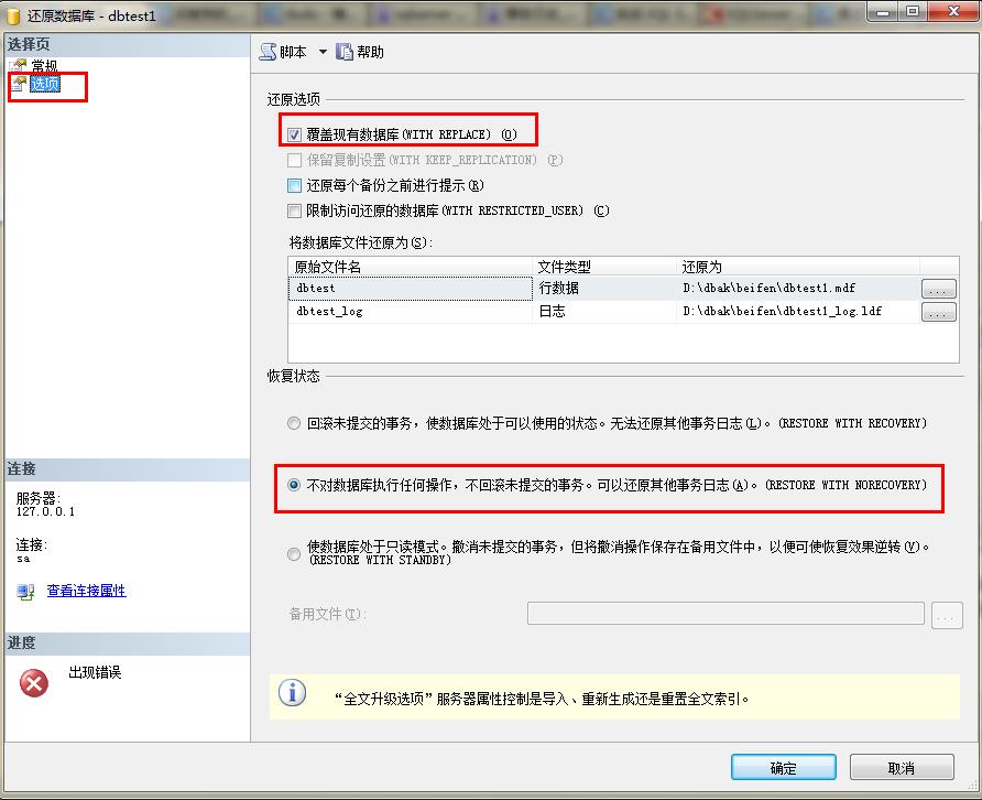 3、如果恢复的日志数据出现”LSN“太早和太晚说明了事务日志间的不连续。这时要注意备份 的时间和顺序。