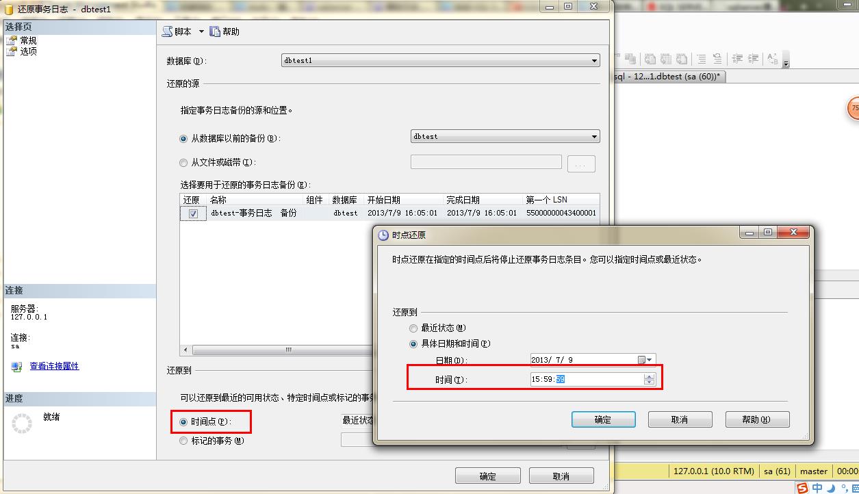 事务日志备份完后,我们可以新建个数据库dbtest1,然后把之前备份的数据库在新建的数据中进行还原,之所以这么做,是因为用事务日志 恢复数据库需要获得数据库的独占访问权,如果在原库上进行恢复,那么这需要对原库停止对外服务,但是这样,可能会导致线上系统不能正常运行,造成非常大的 影响,所以我们新建个数据库用作数据的还原,而不影响线上系统的正常进行。最后把新库中还原回来的数据,再导入到原库中。