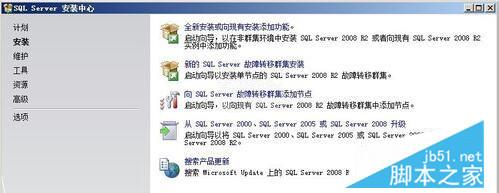 插入2008 R2安装光盘或加载镜像ISO文件,进入SQL Server安装中心后跳过“计划”内容,直接选择界面左侧列表中的“安装”