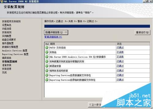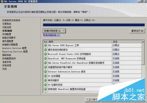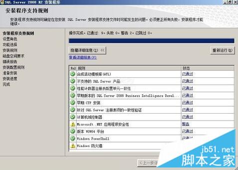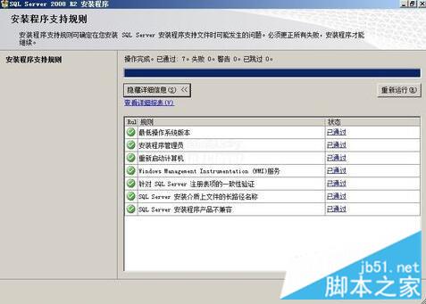 之后进入“安装程序支持规则”安装界面,安装程序将自动检测安装环境基本支持情况,需要保证通过所有条件后才能进行下面的安装,如图所示。当完成所有检测后,点击“确定”进行下面的安装。