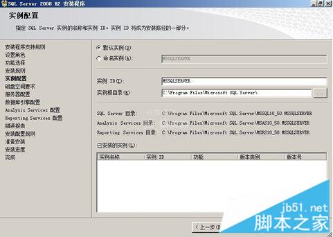 接下来是“实例配置”,这里选择默认的ID和路径。系统自动将这个实例命名为:MSSQLSERVER 。