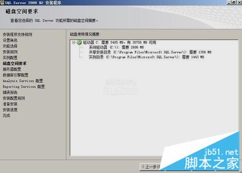 在完成安装内容选择之后会显示磁盘使用情况,可根据磁盘空间自行调整,可以看到,安装SQL Server的全部功能需要5485MB的磁盘空间。