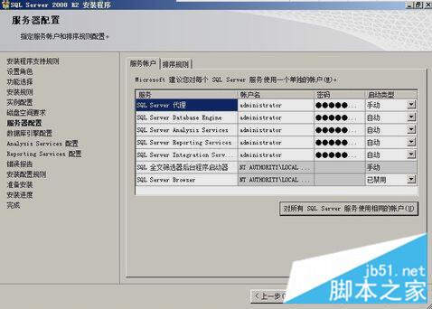 在服务器配置中,需要为各种服务指定合法的账户。注意:这里需要根据用户实际需求做出调整,本文没有深入研究用户设置的影响,统一使用一个用户“Administrator”