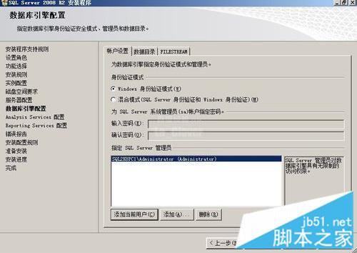 接下来是数据库登录时的身份验证,这里需要为SQL Server指定一位管理员,本文以系统管理员作为示例,如图所示。建议:在服务器上安装SQL Server时,安全起见为此建立独立的用户进行管理。数据库引擎的设置主要有3项。