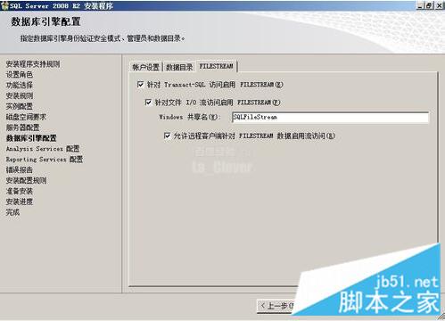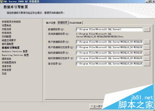通过“安装程序支持规则”检察之后进入“功能选择”界面,这里选择需要安装的SQL Server功能,以及安装路径。建议:由于数据和操作日志文件可能会特别庞大,请谨慎选择安装路径,或在建立数据库时选择专有的保存路径。我们点一下“全选”按钮,会发现左边的目录树多了几个项目:在“安装规则”后面多了一个“实例配置”,在“磁盘空间要求”后面多了“服务器配置”、“数据库引擎配置”、“Analysis Services配置”和“Reporting Services配置”。