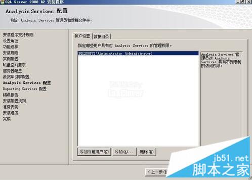 为“Analysis Services配置”指定管理员,本文以系统管理员作为示例。建议:在服务器上安装SQL Server时,安全起见为此建立独立的用户进行管理。