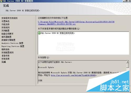 直到最后,出现了这个画面,总算大功告成了。如图所示,此时SQL Server 2008完成了安装,并将安装日志保存在了指定的路径下。