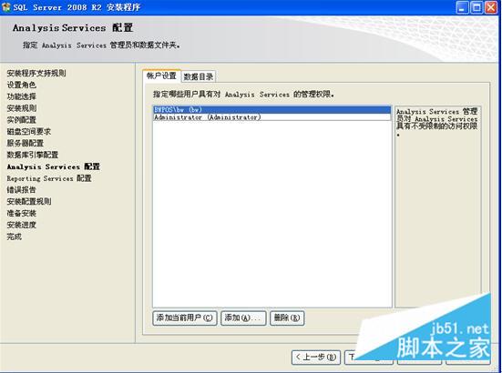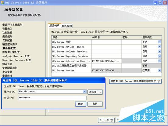 SQLSERVER2008可以对不同服务指定不同帐户,我们一般点“对所有 SQLSERVER服务使用相同帐户”,选择windows的Administrator 管理员帐户和密码。建议在安装SQLSERVER之前把WINDOWS的管理员密码设置好,安装完SQLSERVER之后不要修改管理员密码。否则可能导致SQLSERVER服务无法启动。
