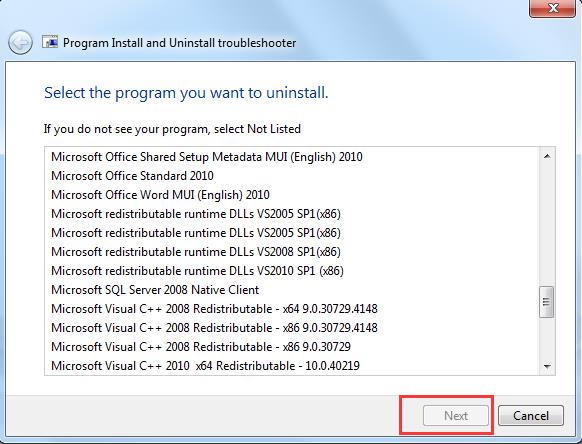 http://download.microsoft.com/download/7/E/9/7E9188C0-2511-4B01-8B4E-0A641EC2F600/MicrosoftProgram_Install_and_Uninstall.meta.diagcab1.1 下载双击打开后,直接选next