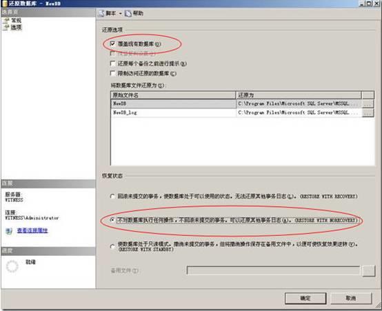 将备份文件在备机上使用主机的全备文件进行还原,在还原数据的时候需要使用选上“with non recover”。如图所示: