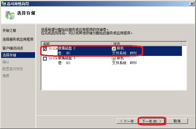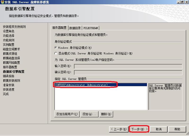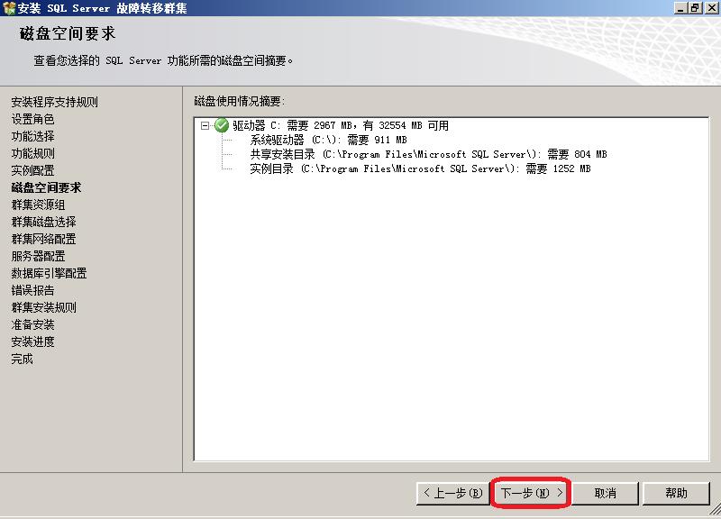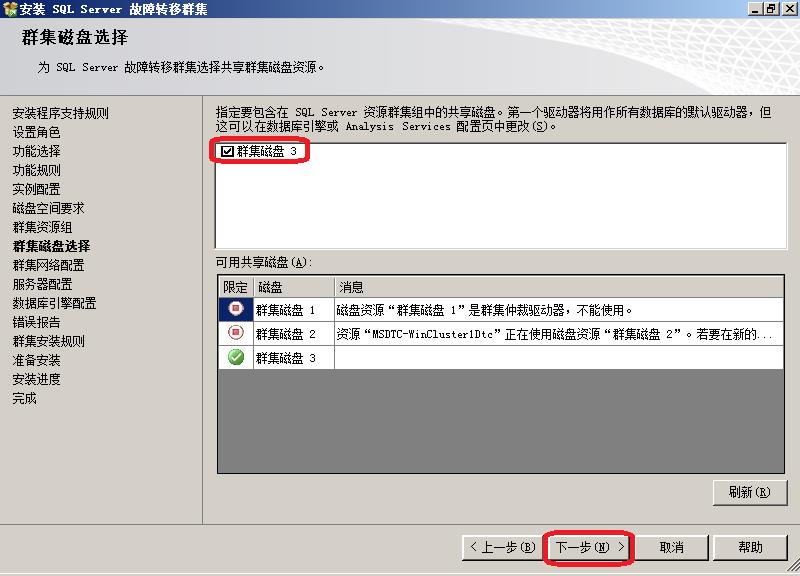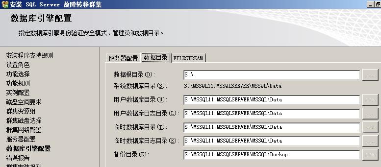 由于安装在群集上,数据库的数据文件将存放在共享磁盘上(即安装在前面配置“群集磁盘选择”时所选的磁盘上),如下图: