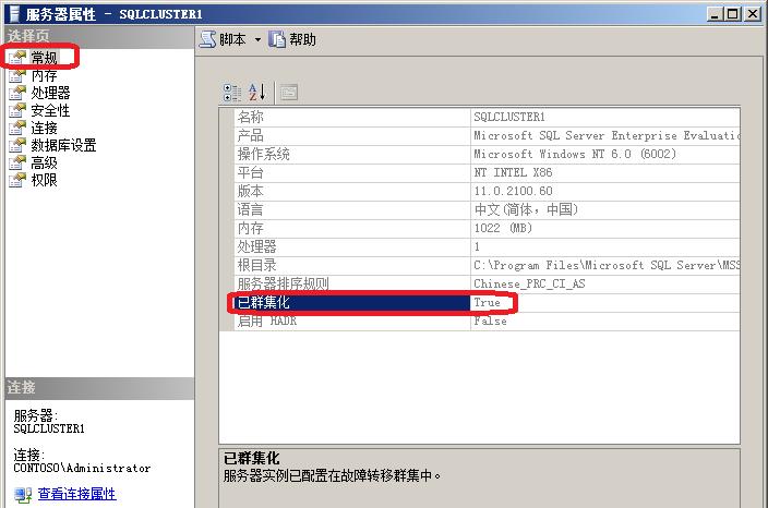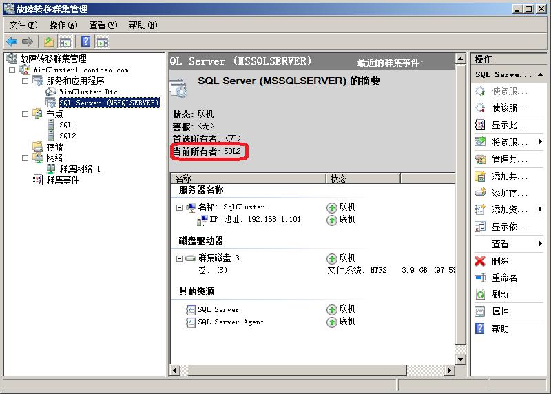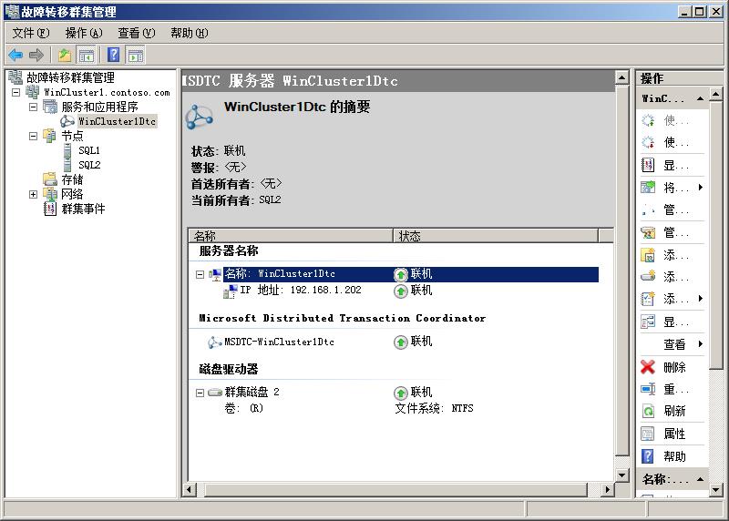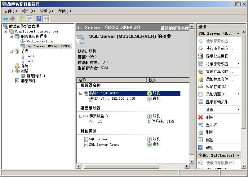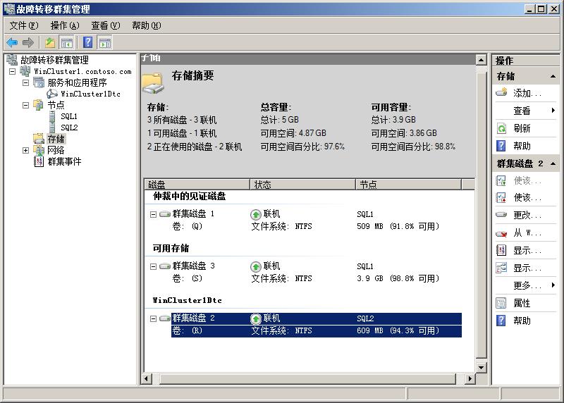 SQL1、SQL2加入contoso.com域,连接到iSCSI磁盘,并且创建了群集,仲裁配置为“节点和磁盘多数”