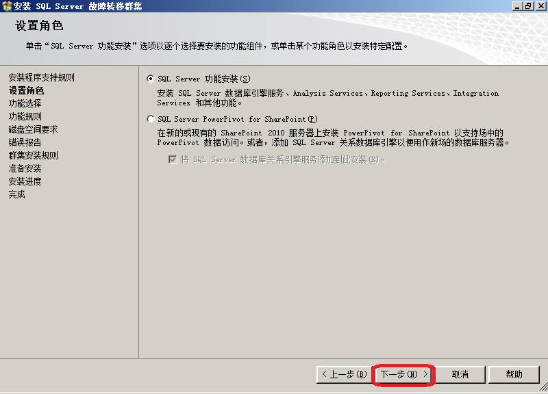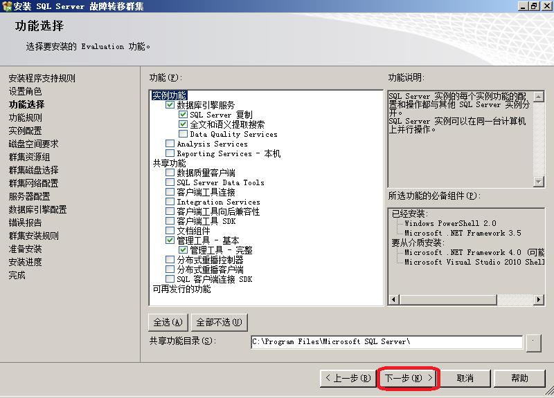 在“功能选择”对话框,建议只在群集上安装“数据库引擎服务”和“管理工具”。