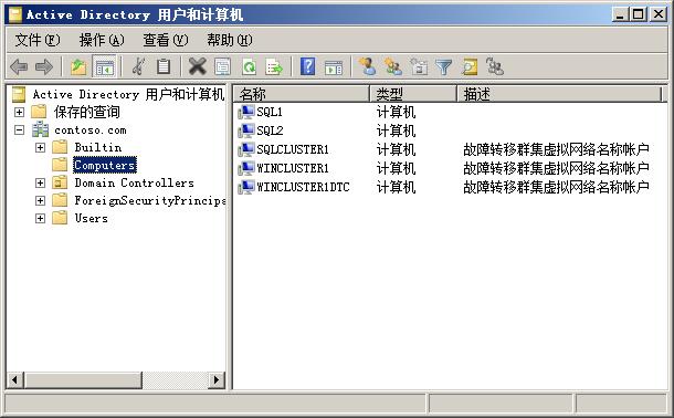 转到域控制器DC1,打开“Active Directory用户和计算机”,在“Computers”容器,可见3个VNN(虚拟网络名称)。