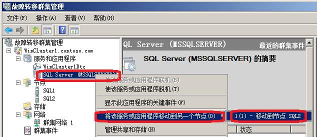 转到任意一个节点,打开“故障转移群集管理”,“将该服务或应用程序移动到另一个节点”。