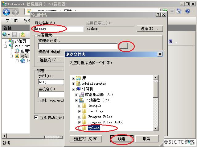 9、输入网站名称-点击选择物理路径-选择upload-点击确定