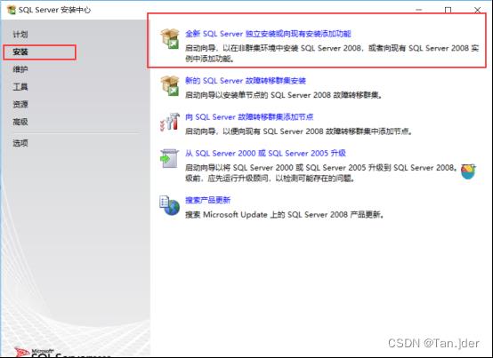 2.打开后点击界面左侧的【安装】,然后点击右侧的【全新SQL Server 独立安装或向现有安装添加功能】