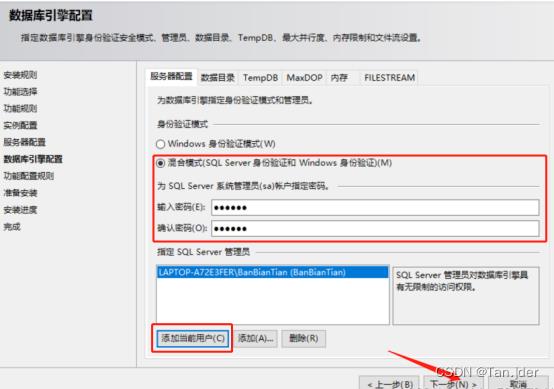 13.进入【数据库引擎配置】,设置“身份验证模式”为“混合模式”,设置密码(密码用于之后的连接登录数据库),并点击“添加当前用户”,这样管理员就是系统管理员,设置好之后,直接单击【下一步】