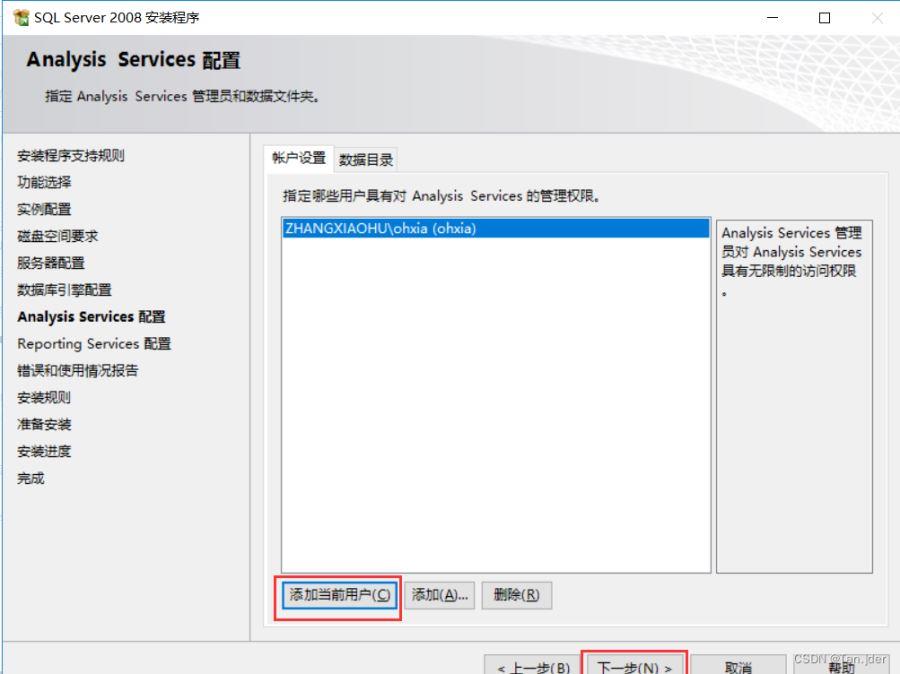 14.进入【Analysis Services配置】,单击【添加当前用户】指定SQL Server管理员,设置好之后,直接单击【下一步】