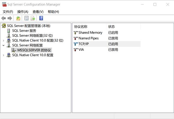 (2)如下图,找到SQL Server网络配置,MSSQLSERVER协议,右键点击 TCP/IP,开启