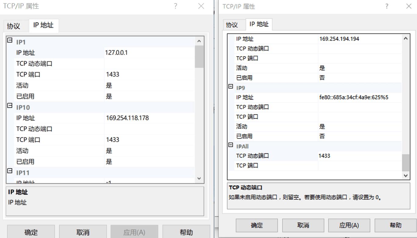 (3)点击TCP/IP协议,选择属性-IP 地址,在IP1的IP地址写127.0.0.1 and TCP端口写1433,IPALL-TCP动态端口 填写1433,这一页所有“否”改“是”