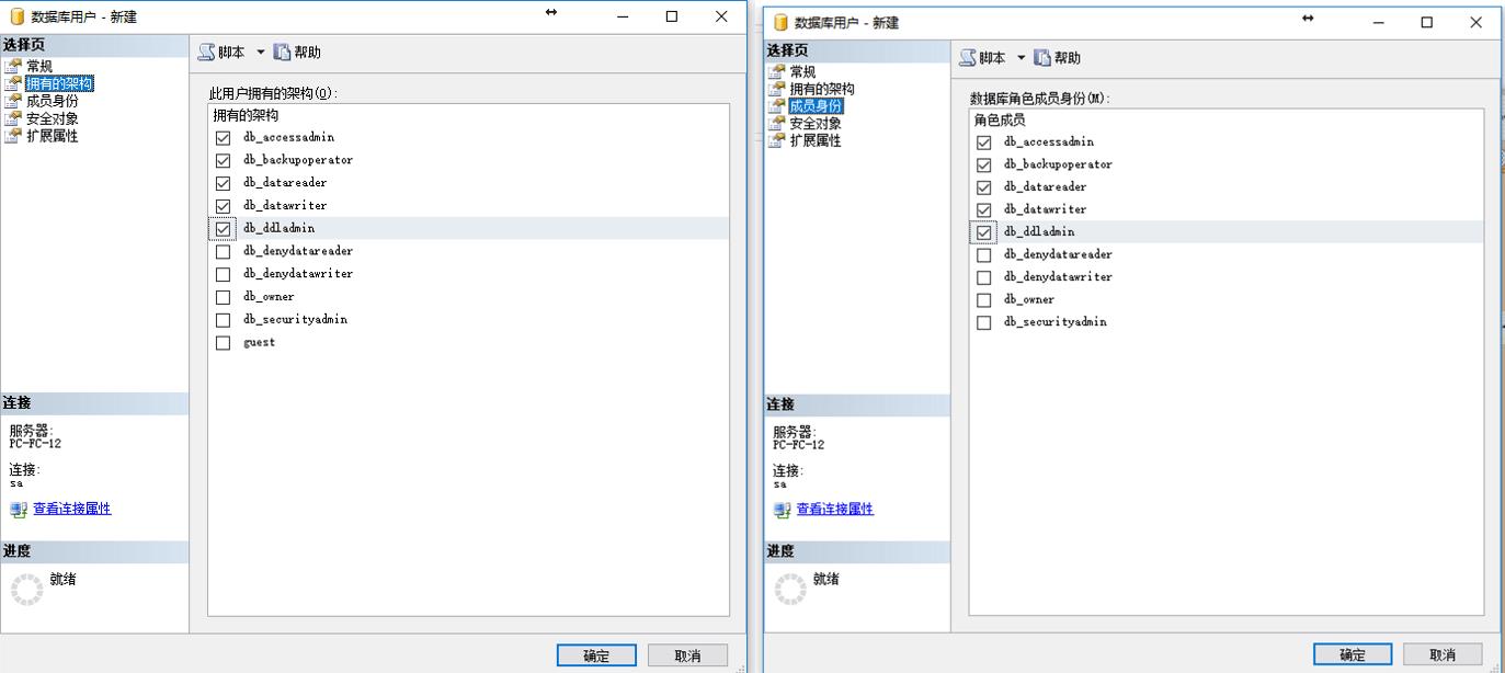 (4)选择要使用的数据库,在安全性中右键用户——新建用户,给刚刚建立的sa用户名配置相应的内容