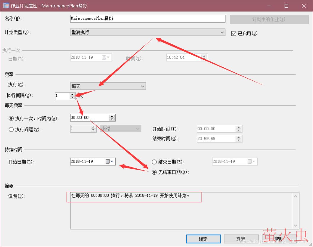 在出现的“作业计划属性”界面中,更改执行时间,也就是多久备份一次。这里该为每天备份。间隔时间更改为“1”更改执行一次时间为0:00:00也就是在每天的0点自动备份数据。