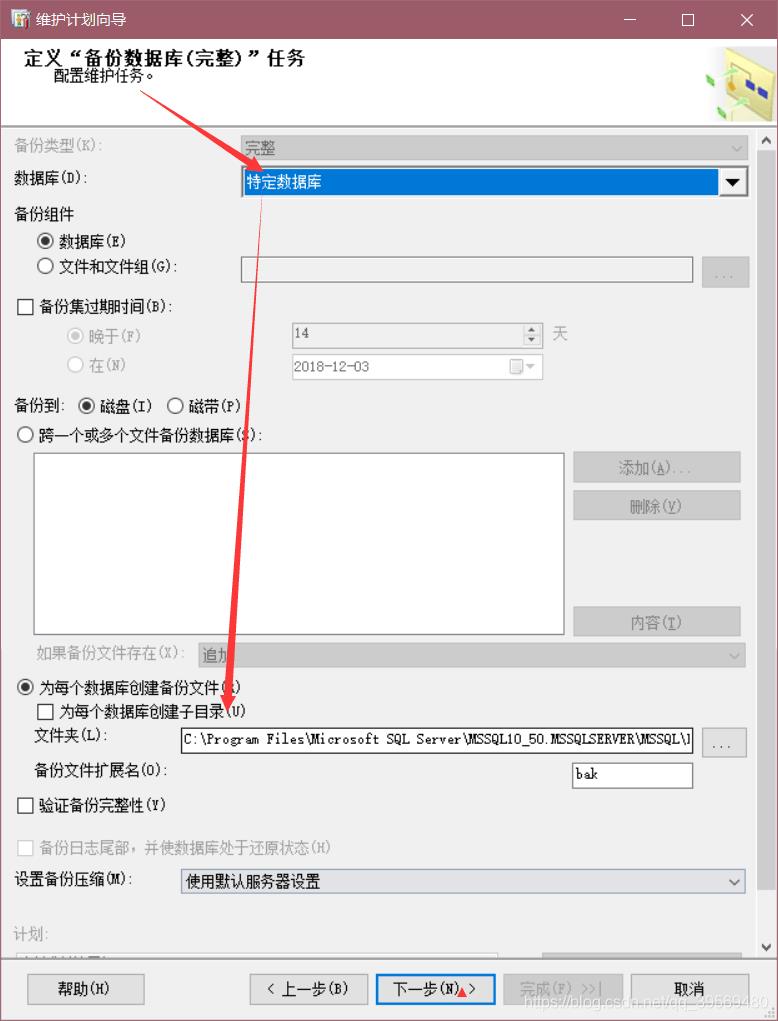在定义“备份数据库完整”界面中,选择数据库后面下拉菜单中的数据库文件。然后点击“确定”按钮