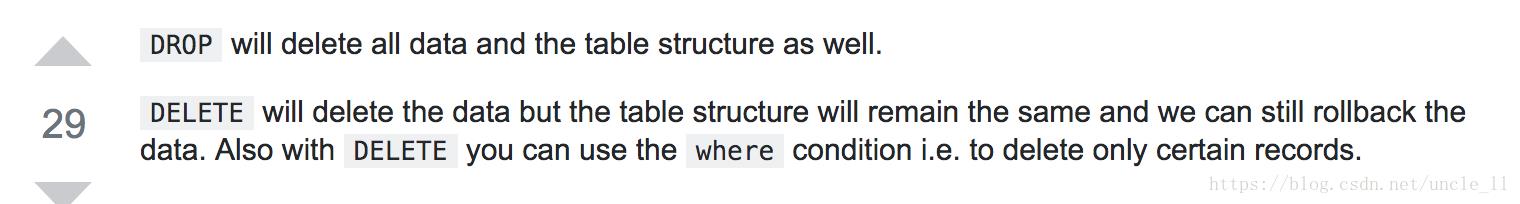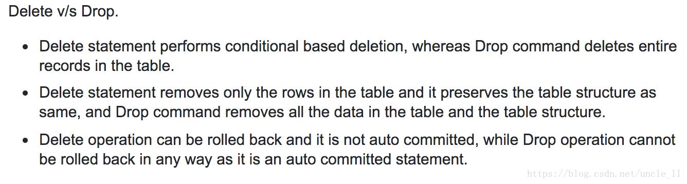 * drop操作会删除所有的数据以及表结构 * delete操作会删除数据,但会保留表结构,并且在之后需要时可以回滚数据。此外,delete操作还可以加一些其它的where条件,比如删除确定的记录。