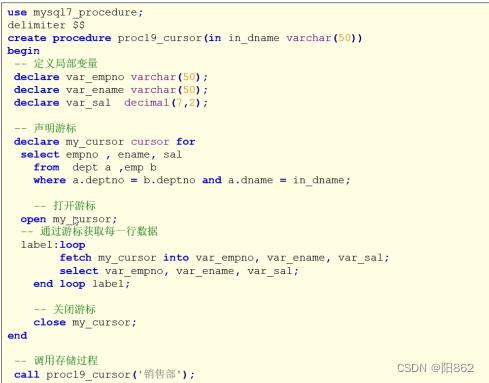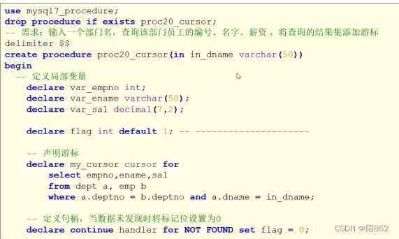 在语法中,变量声明、游标声明、handler声明是必须按照先后顺序书写的,否则创建存储过程出错。
